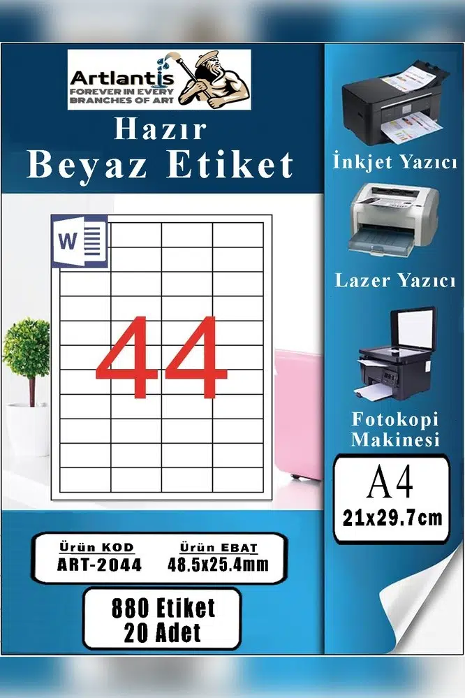 Ürün Adı: Artlantis A4 Hazır Etiket 48.5x25.4 mm 20 Sayfa 1 Paket 44 lü Kendinden Yapışkanlı Fotokopi Lazer İnkjet Kağıdı Yazıcılar İçin Uyumlu Mokel Kod : 2044