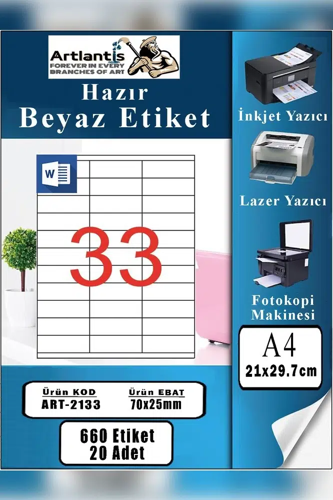 Ürün Adı: Artlantis A4 Hazır Etiket 70x25 mm 20 Sayfa 1 Paket 33 lü Kendinden Yapışkanlı Fotokopi Lazer İnkjet Kağıdı Yazıcılar İçin Uyumlu Mokel Kod : 2133