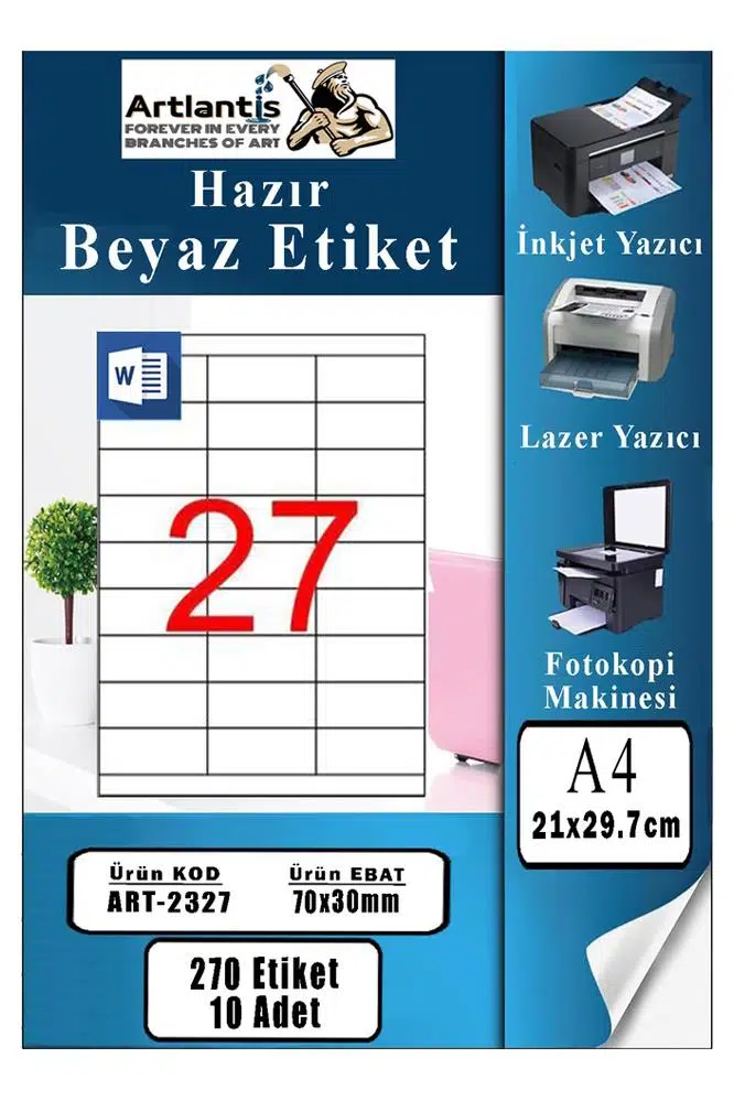 Ürün Adı: A4 Hazır Etiket 70x30 mm 10 Sayfa 1 Paket 27 li Kendinden Yapışkanlı Fotokopi Lazer İnkjet Kağıdı Yazıcılar İçin Uyumlu Model Kod : 2327