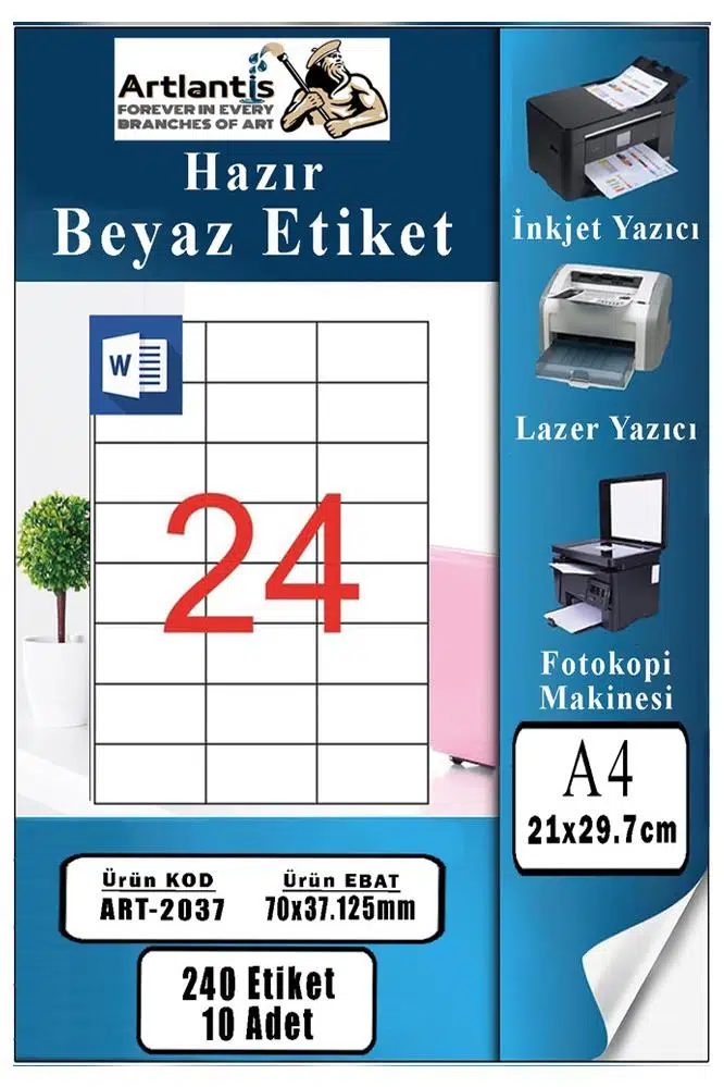 Ürün Adı: A4 Hazır Etiket 70x37.12 mm 10 Sayfa 1 Paket 24 lü Kendinden Yapışkanlı Fotokopi Lazer İnkjet Kağıdı Yazıcılar İçin Uyumlu Mokel Kod : 2037