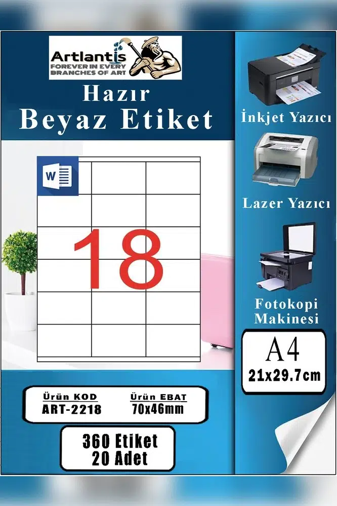 Ürün Adı: Artlantis A4 Hazır Etiket 70x46 mm 20 Sayfa 1 Paket 18 li Kendinden Yapışkanlı Fotokopi Lazer İnkjet Kağıdı Yazıcılar İçin Uyumlu Mokel Kod : 2218