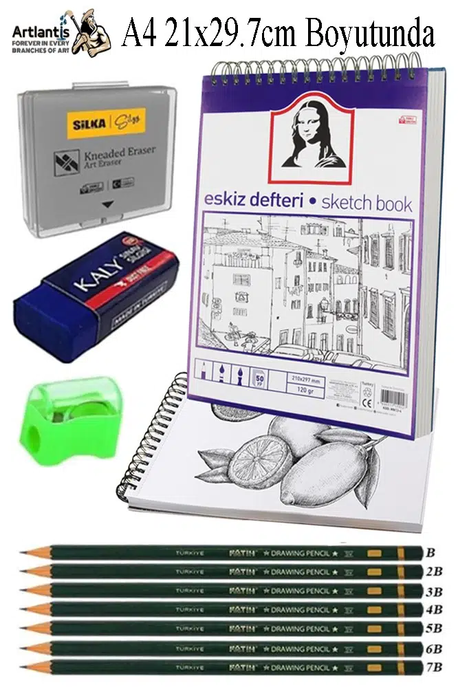 Ürün Adı: A4 Telli Eskiz Defteri Spralli 50 Yaprak Karakalem Çizim Seti Fatih Dereceli Kalem Hamur Silgi Sınav Silgisi Kalemtraş