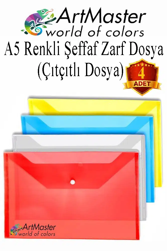 Ürün Adı: Artmaster A5 Çıtçıtlı Dosya Şeffaf Renkli Zarf Dosya 4 Renk 17x22 cm Çıt Çıtlı Dosya Su Geçirmez 50 Yaprak Kapasiteli
