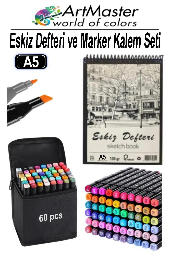 - Eskiz defteri a5 Spralli 50 yaprak 1 adet 60 renk çift taraflı markör 1 paket