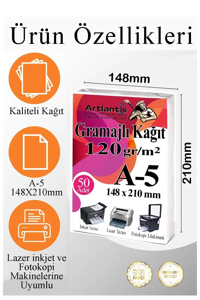 Ürün Adı: Artlantis A5 Gramajlı Fotokopi Kağıdı 100 Adet 120 gr Sertifika Kağıdı Kalın Kağıt Baskı Tüm Yazıcılara Uyumlu 14.8x21cm Ofis Büro
