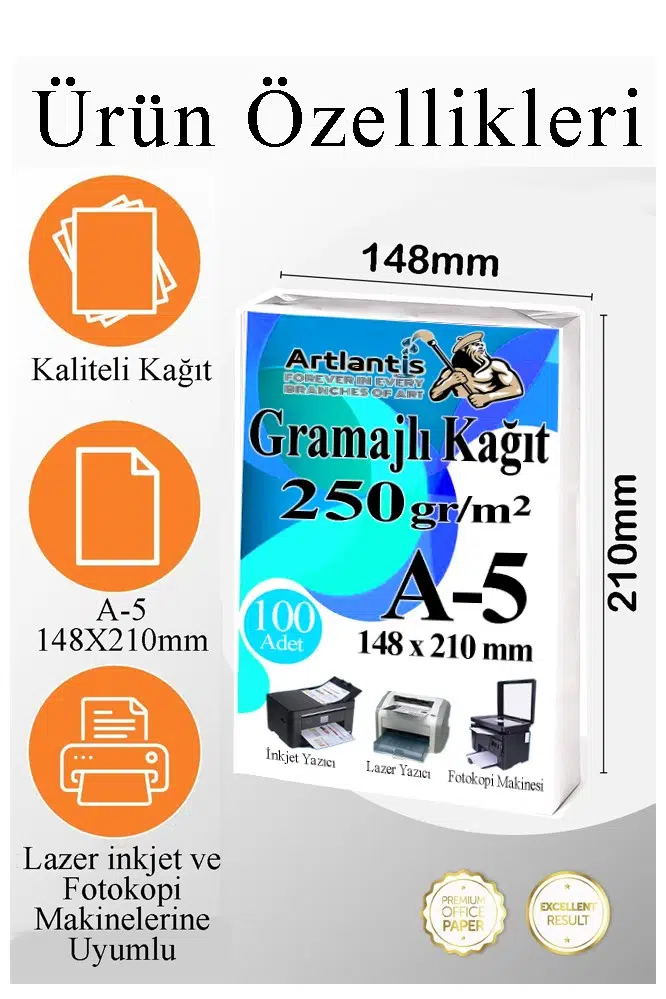 Ürün Adı: Artlantis A5 Gramajlı Fotokopi Kağıdı 100 Adet 250 gr Sertifika Kağıdı Kalın Kağıt Baskı Tüm Yazıcılara Uyumlu 14.8x21cm Ofis Büro