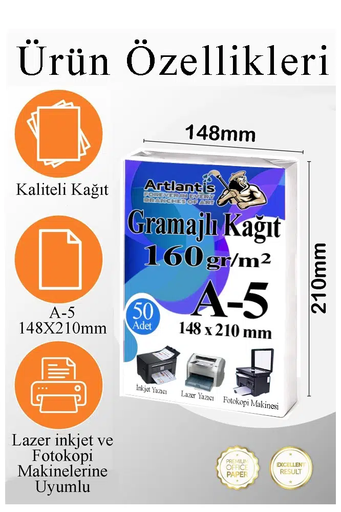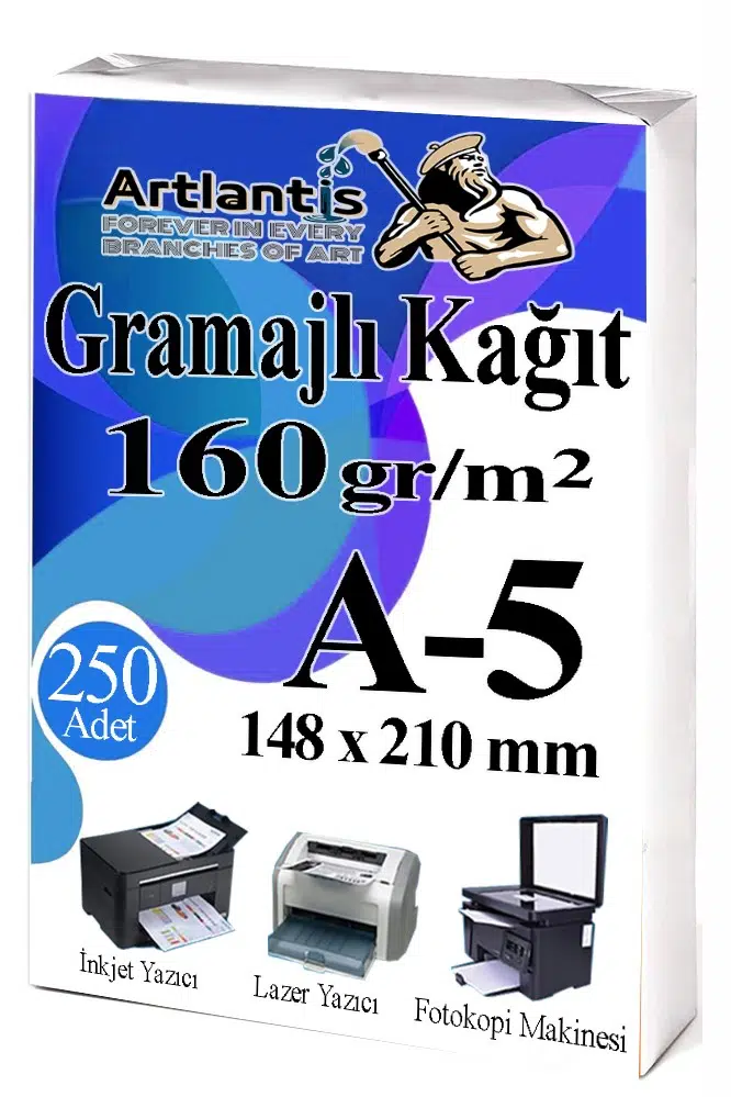 Ürün Adı: Artlantis A5 Gramajlı Fotokopi Kağıdı 250 Adet 160 gr Sertifika Kağıdı Kalın Kağıt Baskı Tüm Yazıcılara Uyumlu 14.8x21cm Ofis Büro