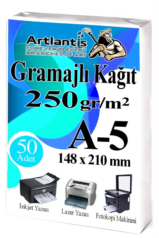 Ürün Adı: Artlantis A5 Gramajlı Fotokopi Kağıdı 50 Adet 250 gr Sertifika Kağıdı Kalın Kağıt Baskı Tüm Yazıcılara Uyumlu 14.8x21cm Ofis Büro