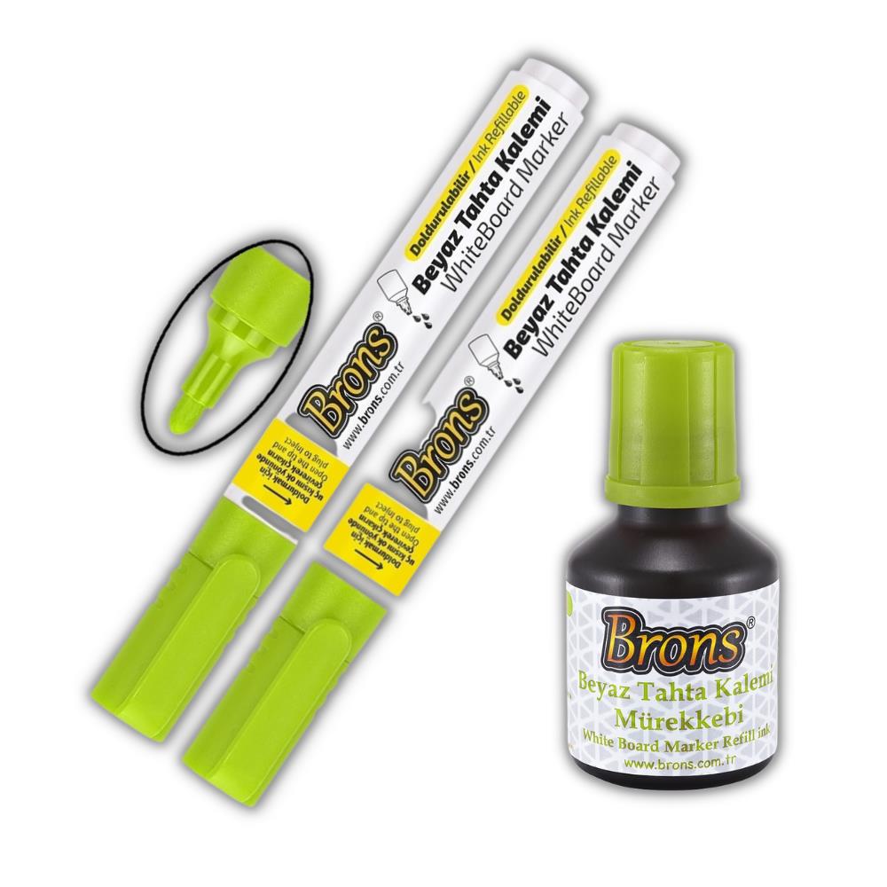 Ürün Adı: Brons Açık Yeşil Yazı Tahta Kalemi Doldurulabilir 2 Adet ve Silinebilir Mürekkep 30 ml 1 Adet Brons Yazı Tahta Kalem Seti