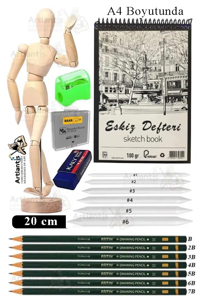 Ürün Adı: Ahşap İnsan Modeli 20 cm A4 21x29,7cm Eskiz Defteri Dereceli Karakalem Seti Dağıtma Kalemi Hamur Silgi Kalemtraş