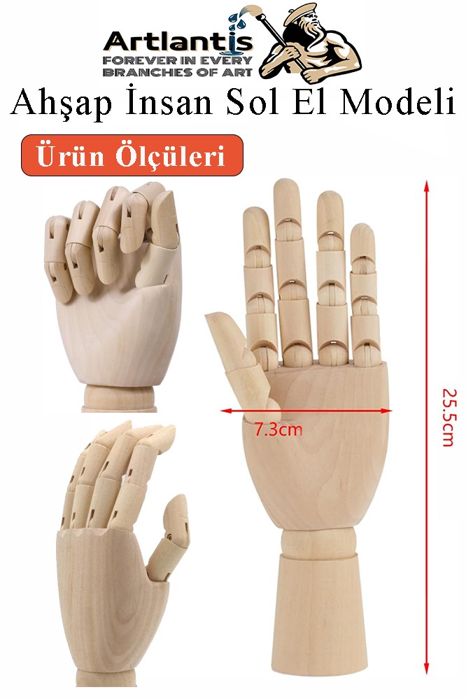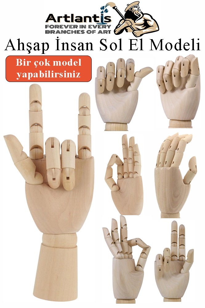Ürün Adı: Ahşap Sol El Modeli 25 cm 1 Adet Sol El Maketi Bayan Ahşap Manken Sol El Parmak Model Hareketli Esnek Eskiz Çizim Boyama