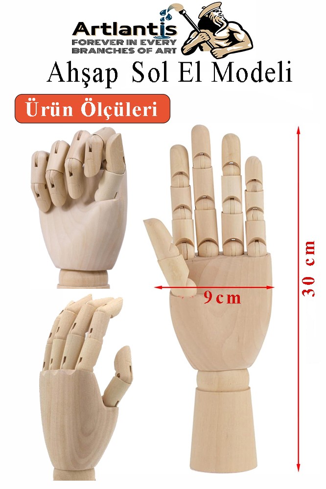 Ürün Adı: Ahşap Sol El Modeli 30 cm 1 Adet Sol El Maketi Erkek Ahşap Manken Sol El Parmak Model Hareketli Esnek Eskiz Çizim Boyama