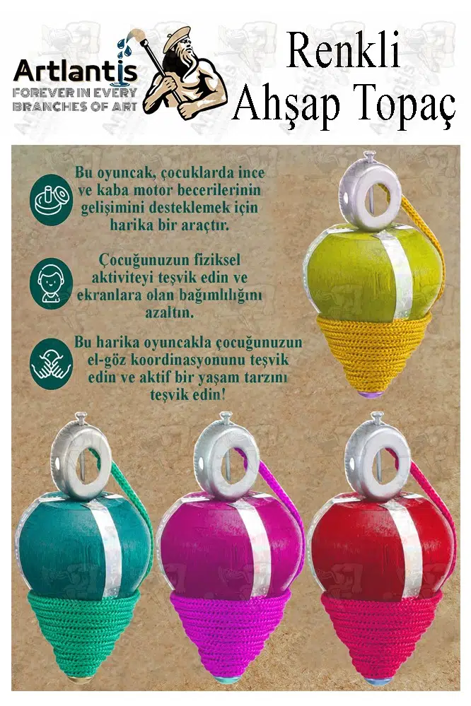 Ürün Adı: Artlantis Ahşap Topaç 2 Adet Renkli Kaliteli Ahşap Topaç İpli Dönene Zilli Ağaç Topaç Nostaljik Oyuncak Geleneksel Okul Öncesi