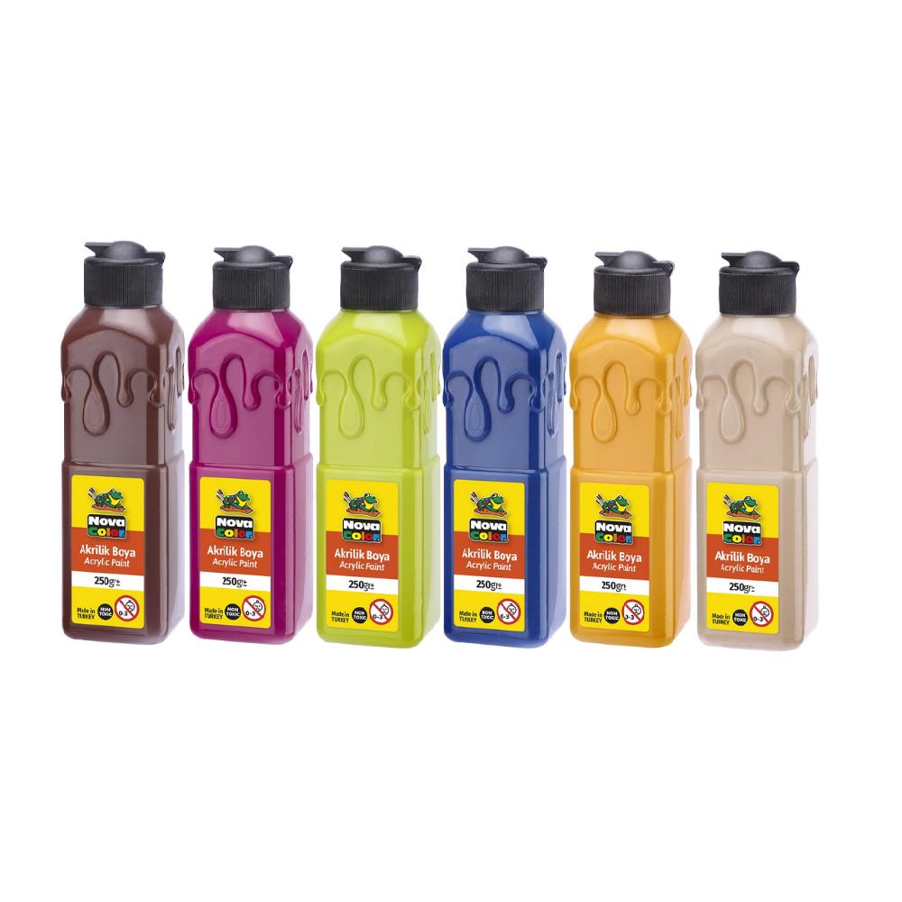 Ürün Bilgilendirmesi: Nova Color Akrilik Boyalar 6 Ara Renk 250 Ml 1 Paket (kahverengi -magenta-fıstık yeşili-lacivert-güneş sarısı-ten rengi)