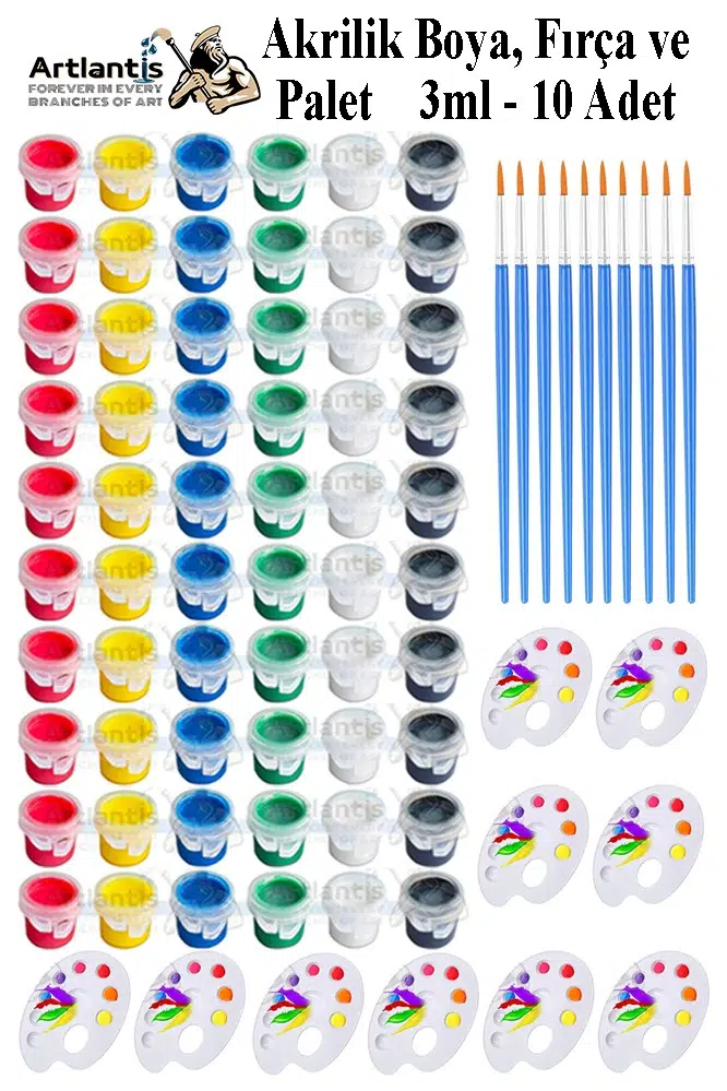 Ürün Adı: Akrilik Boya 3 ml 6 Renk Resim Fırçası ve Paleti 10 Paket Mini Küçük Akrilik Boya Taş Ahşap Seramik Tuval Alçı Tuval