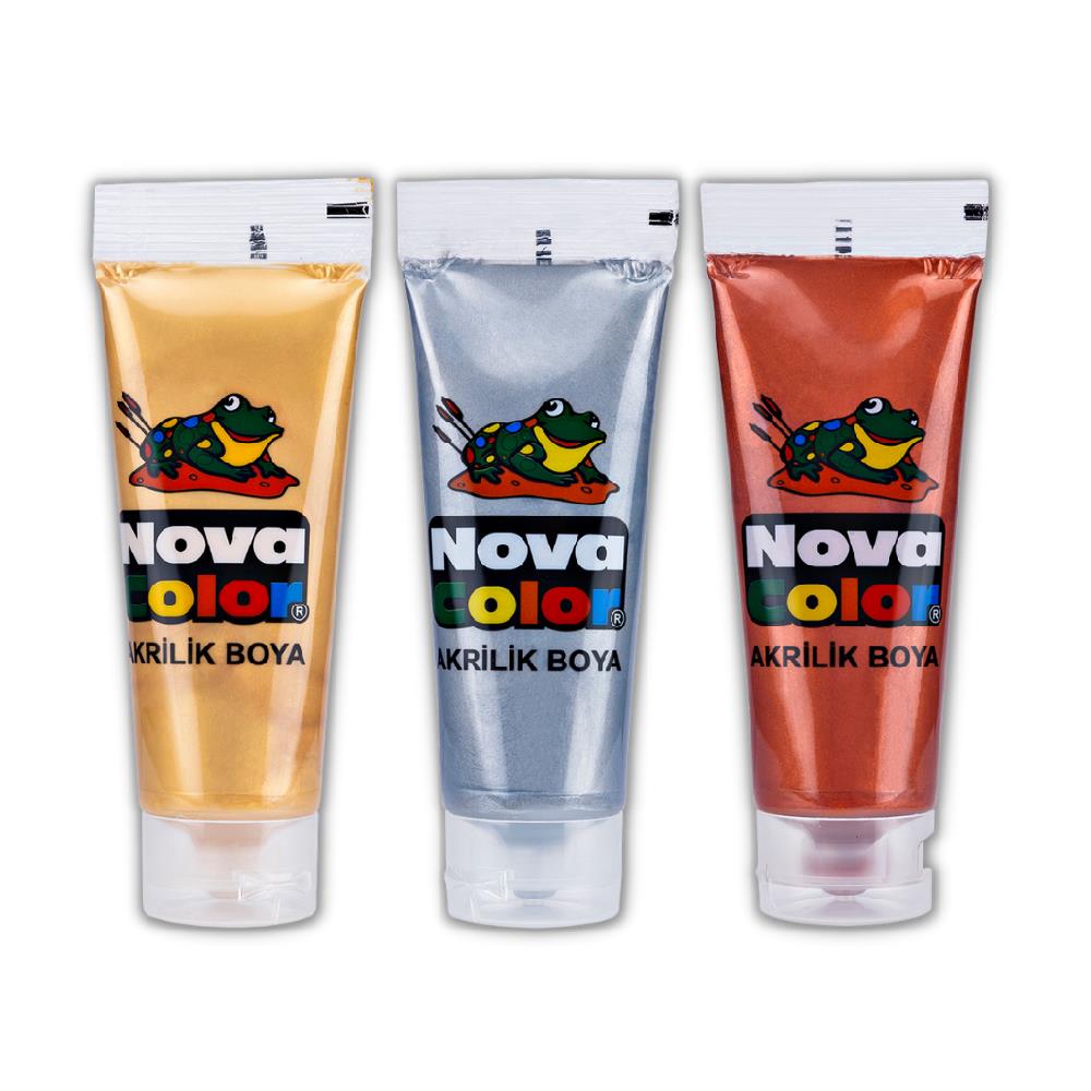 Ürün Adı: Nova Color Akrilik Boya Simli Gümüş Gri, Simli Altın Sarısı ve Bakır Yaldız 75 Ml Tüp 2 Adet