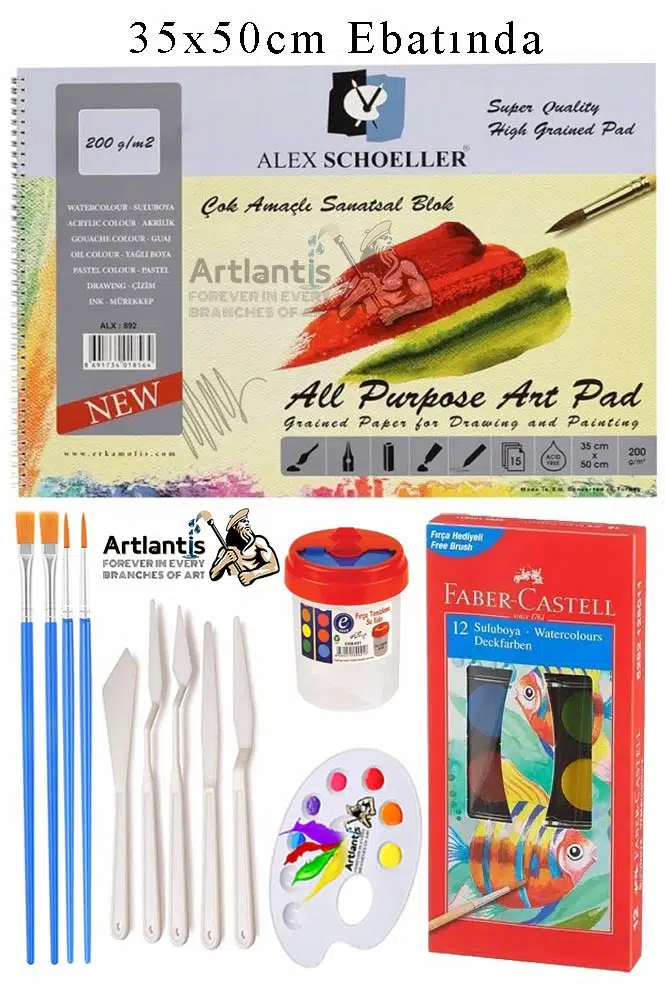 Alex Schoeller Çok Amaçlı Sanatsal Blok 35x50 200 gr 15 Yaprak Faber 12 Renk Sulu Boya Plastik Spatula Fırça