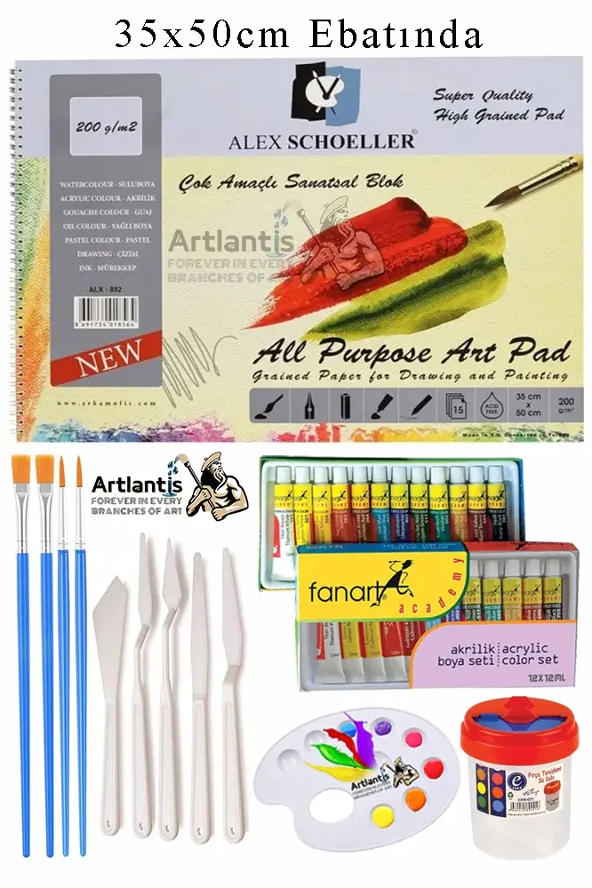 Alex Schoeller Çok Amaçlı Sanatsal Blok 35x50 200 gr 15 Yaprak Fanart 12 Renk 12 ml Akrilik Boya Plastik Spatula Fırça