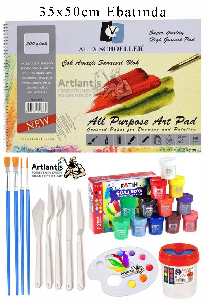 Alex Schoeller Çok Amaçlı Sanatsal Blok 35x50 200 gr 15 Yaprak Fatih 12 Renk 20 ml Guaj Boya Plastik Spatula Fırça