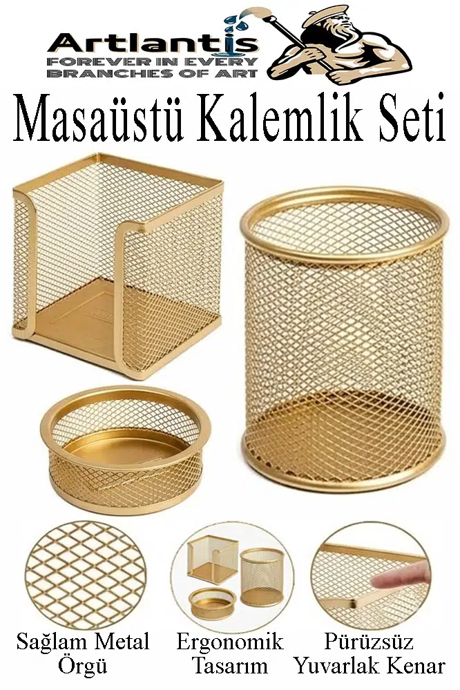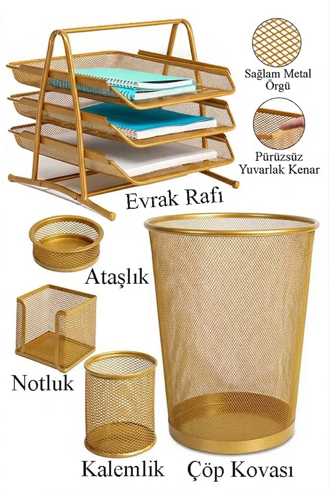 | Etiketler | Altın Sarı Metal Evrak Rafı 3 lü Masaüstü Kalemlik 3 lü ve Fileli Çöp Kovası 1 Paket Masaüstü A4 Dosya Düzenleyici Not |
