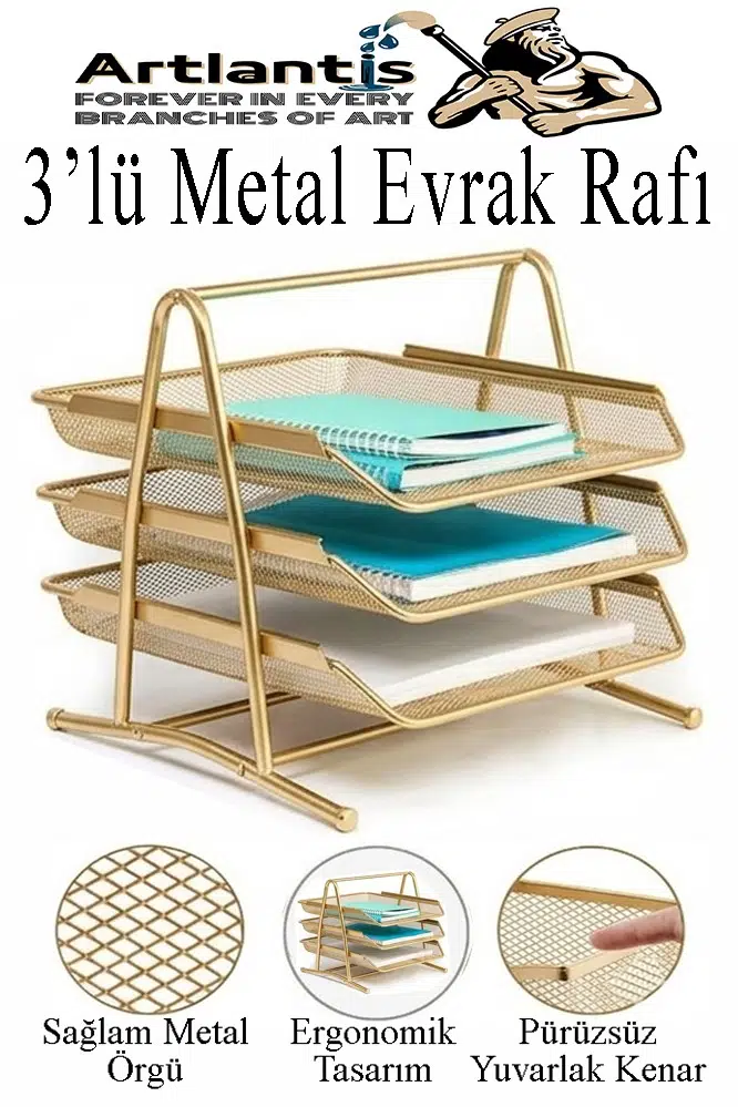 Ürün Adı: Artmaster Altın Sarı Metal Evrak Rafı 3 lü Masaüstü Kalemlik 3 lü ve Fileli Çöp Kovası 1 Paket Masaüstü A4 Dosya Düzenleyici Not