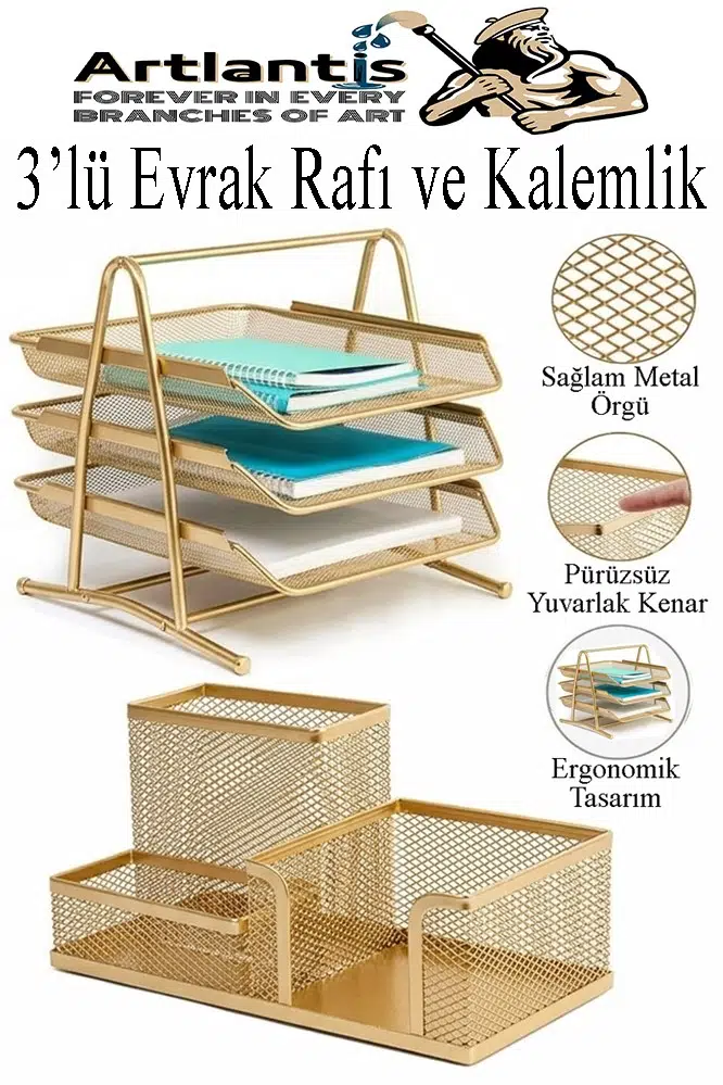 | Etiketler | Altın Sarı Metal Evrak Rafı 3 lü ve Masaüstü Kalemlik 1 Paket Masaüstü A4 Dosya 3 Katlı Düzenleyici Kağıt Tepsisi Metal |