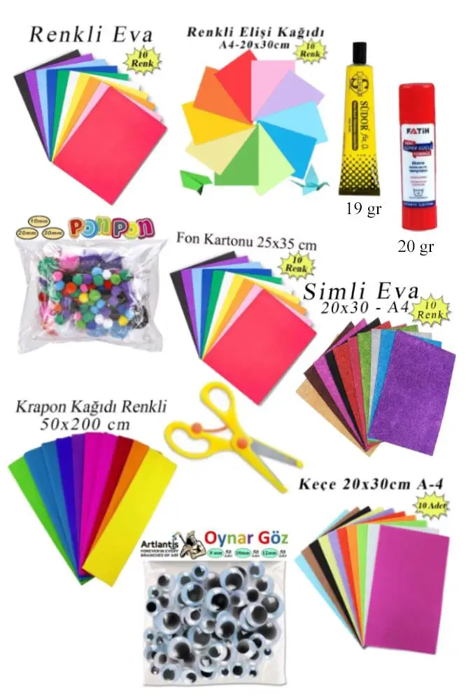 | Etiketler | Anaokulu Etkinlik Seti 11 li 1 Paket Okul Öncesi Gelişim Seti Keçe Oynar Göz Krapon Ponpon Elişi Kağıdı Fon Kartonu Eva Simli Eva |