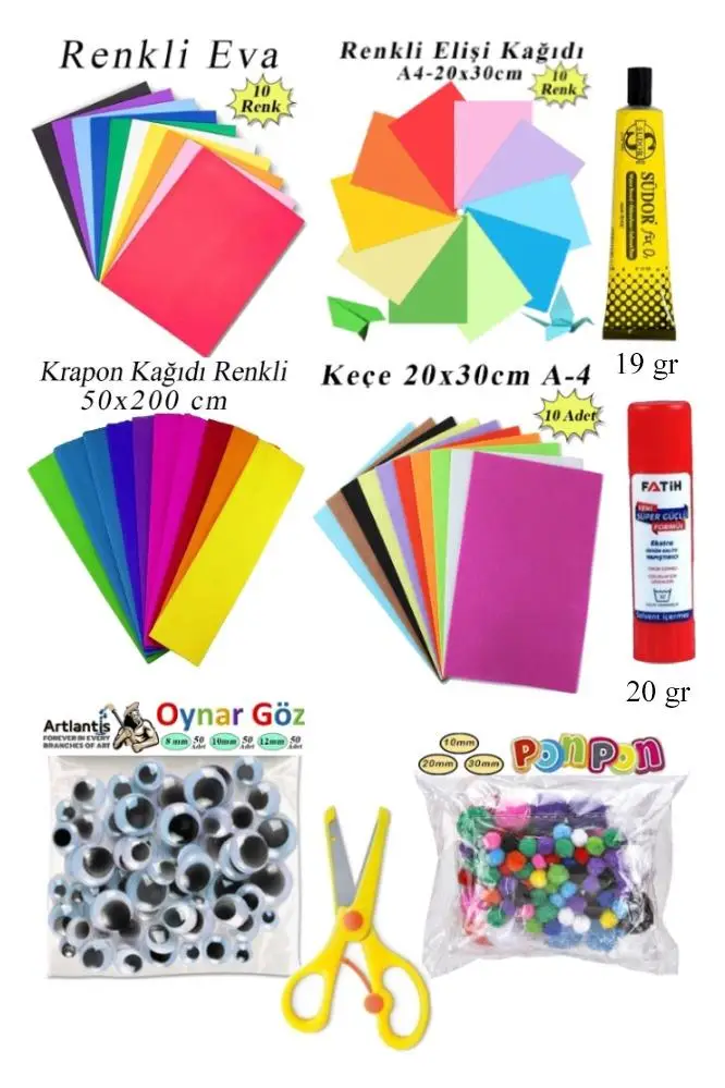 | Etiketler | Anaokulu Etkinlik Seti 9 lu 1 Paket Okul Öncesi Gelişim Seti Eva Keçe Oynar Göz Krapon Ponpon Elişi Kağıdı |