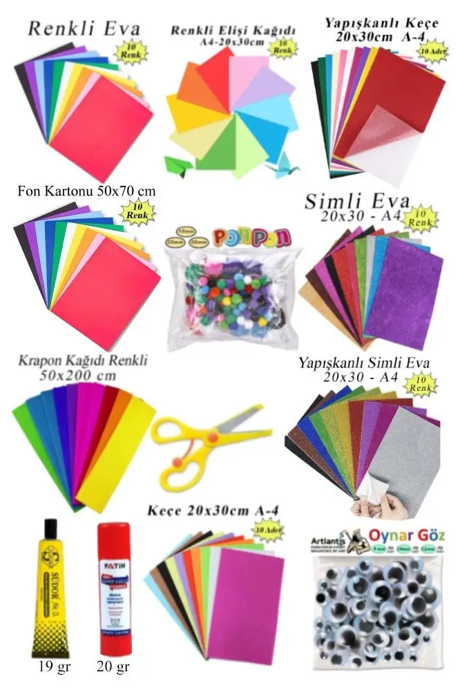 | Etiketler | Anaokulu ve Okul Öncesi Etkinlik Seti 13 Parça 1 Paket Gelişim Seti Keçe Oynar Göz Krapon Ponpon Elişi Kağıdı Fon Kartonu Eva Simli Eva |