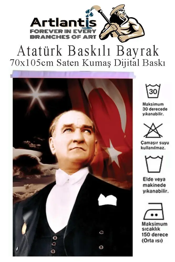 Ürün Adı: Atatürk Baskılı Türk Bayrağı 70x105 cm 1 Paket Bayraklı Atatürk Posteri Dijital Baskı Raşel Kumaş İç ve Dış Ortama Uygundur