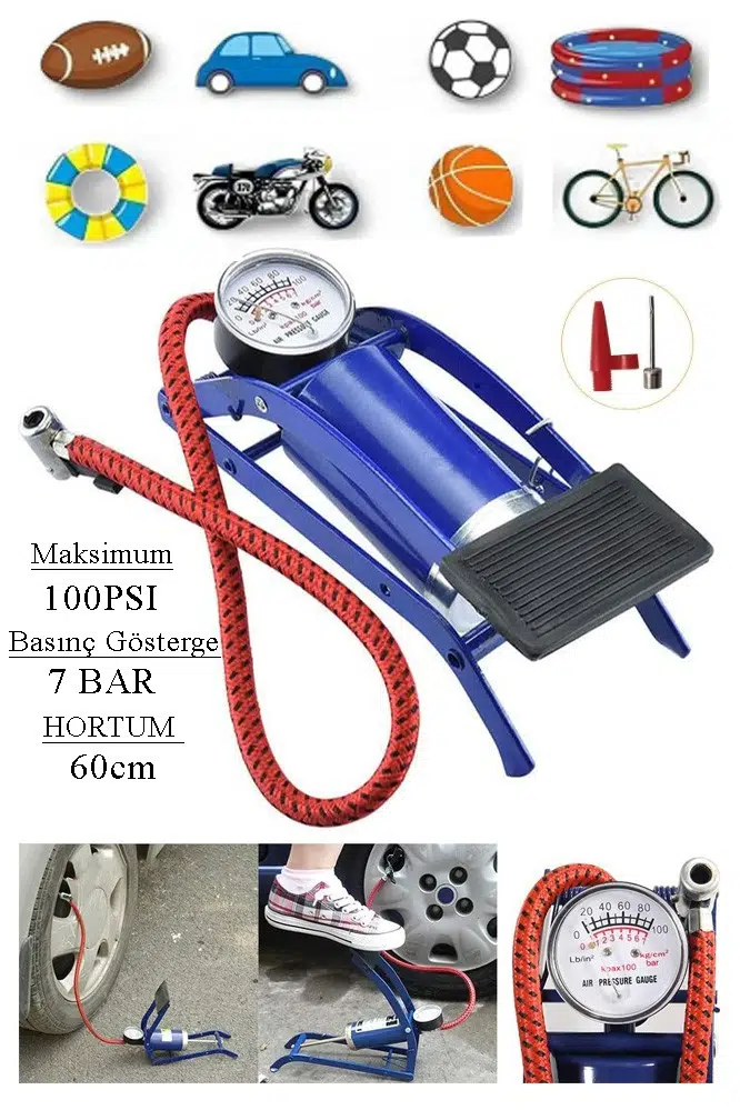 ·Geniş Uygulama Alanı: Çok işlevli ve çeşitli cihazlara uygun olan bu ayak pompası, araba ve bisiklet lastiklerinin yanı sıra oyuncakları, topları ve havuz aksesuarlarını zahmetsizce şişirir.