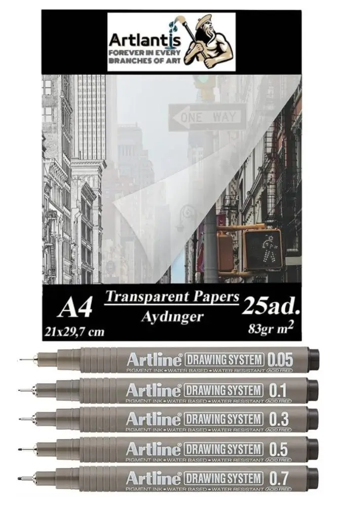 Ürün Adı: Aydınger Kağıdı A4 83 gr 25'li 1 Paket Eskiz Kağıdı Artline Teknik Çizim Kalemi Drawing System 5 Adet