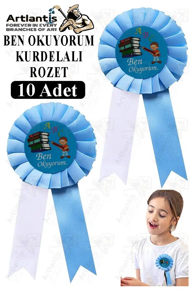 Ürün Adı: Artlantis Ben Okuyorum Kurdelalı Rozet 10 Adet Mavi Beyaz Yaka Rozeti Çocuk Bayram Etkinlik 15 cm Kokart