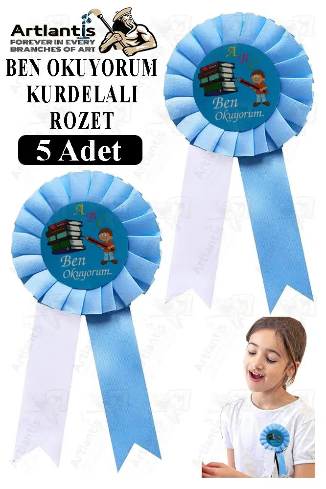 Ürün Adı: Artlantis Ben Okuyorum Kurdelalı Rozet 5 Adet Mavi Beyaz Yaka Rozeti Çocuk Bayram Etkinlik 15 cm Kokart