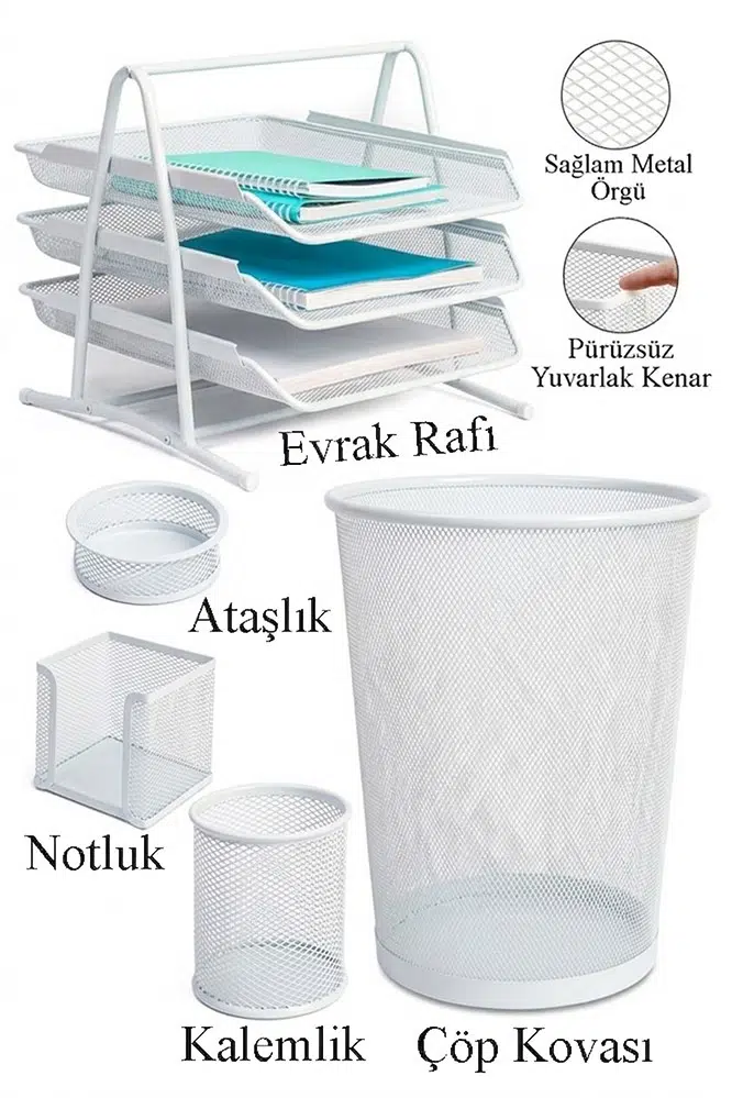 | Etiketler | Beyaz Metal Evrak Rafı 3 lü Masaüstü Kalemlik 3 lü ve Fileli Çöp Kovası 1 Paket Masaüstü A4 Dosya Düzenleyici Not |