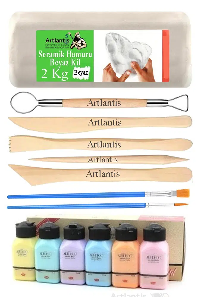 Ürün Adı: Beyaz Seramik Hamuru 2 Kg Ebeşuar Modelleme Artdeco Pastel 6 Renk Akrilik Boya Fırça 75 ml Seramik Çamuru Heykel