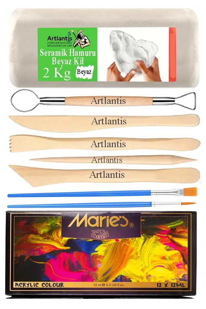 Ürün Adı: Beyaz Seramik Hamuru 2 Kg Ebeşuar Modelleme Maries 12 Renk Akrilik Boya Fırça Seramik Çamuru Heykel Sanat Çömlek