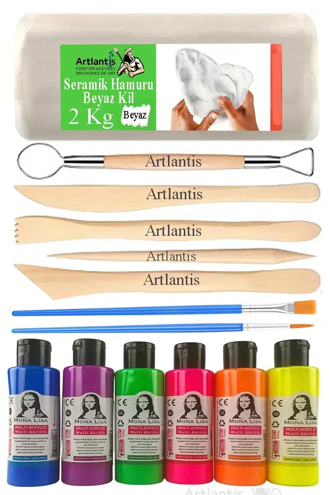Ürün Adı: Beyaz Seramik Hamuru 2 Kg Ebeşuar Modelleme Monalisa Pastel 6 Renk Akrilik Boya Fırça 75 ml Seramik Çamuru Heykel Sanat