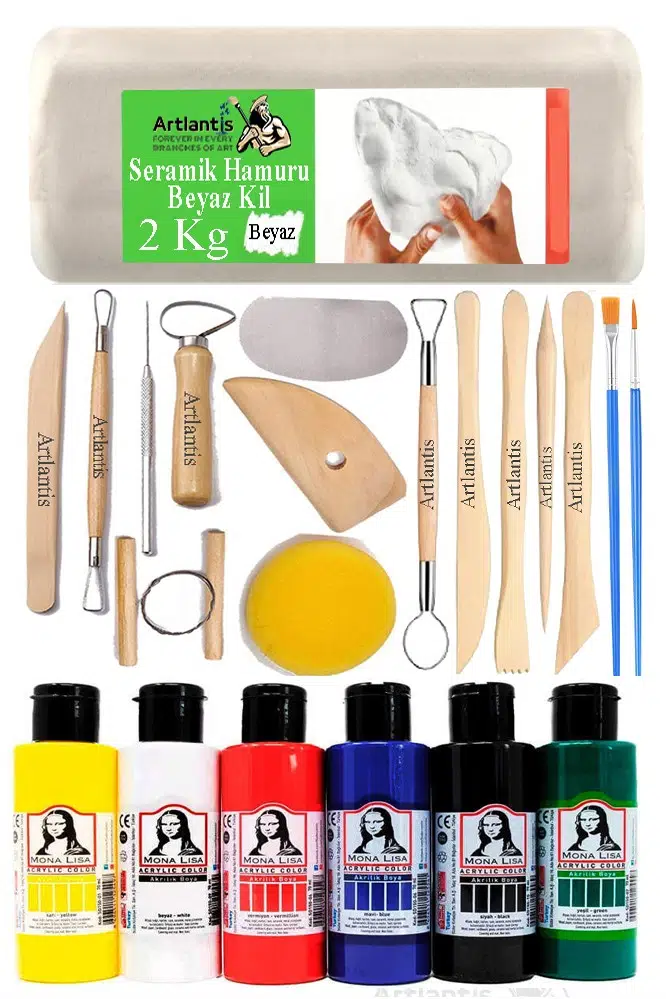 Beyaz Seramik Hamuru 2 Kg Seramik Başlangıç Seti Ebeşuar Modelleme Monalisa 6 Renk Pastel Akrilik Boya Fırça 70ml Heykel