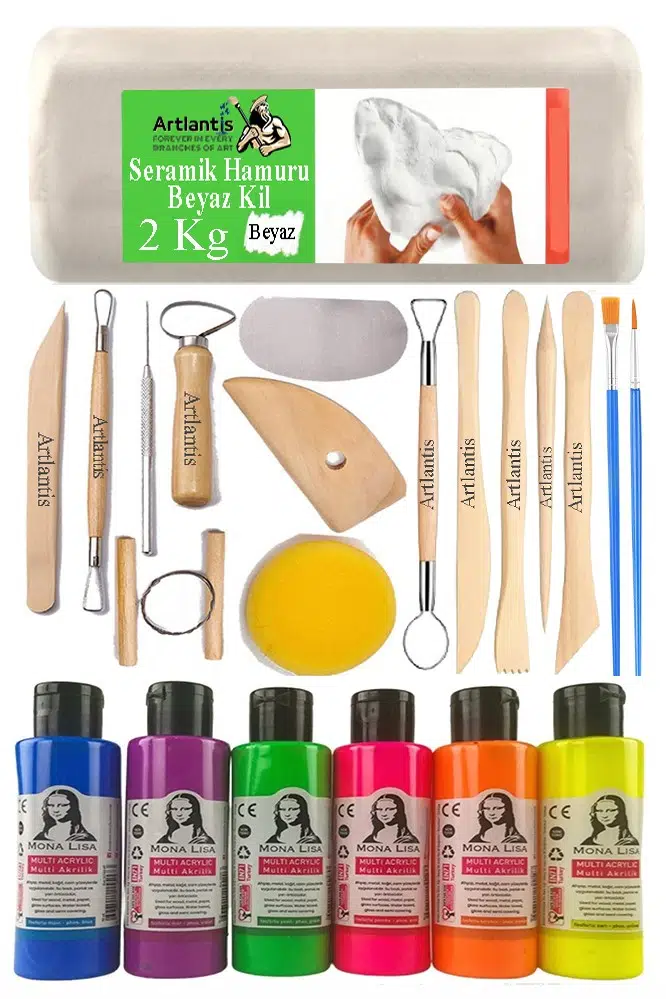 Ürün Adı: Beyaz Seramik Hamuru 2 Kg Seramik Başlangıç Seti Ebeşuar Modelleme Monalisa 6 Renk Neon Akrilik Boya Fırça 70ml Heykel