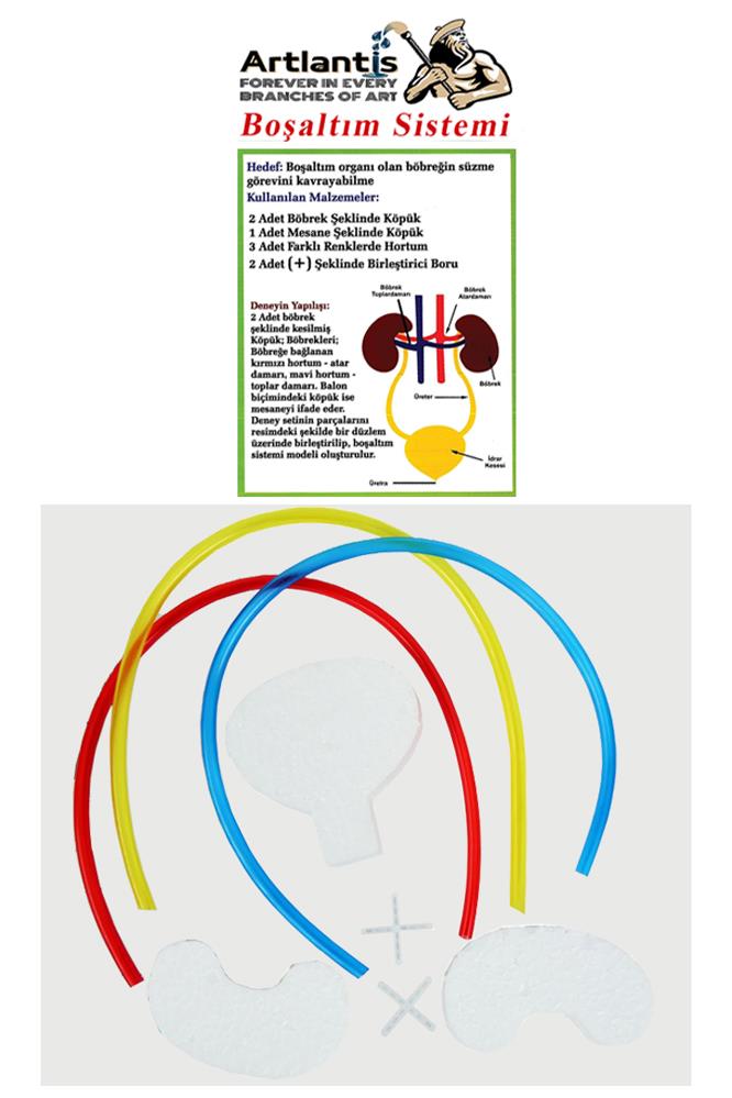 - Deneyin Yapılışı: 2 adet böbrek şeklinde kesilmiş köpük böbrekleri böbreğe bağlanan kırmızı hortum atar damarı mavi hortum toplar damarı.