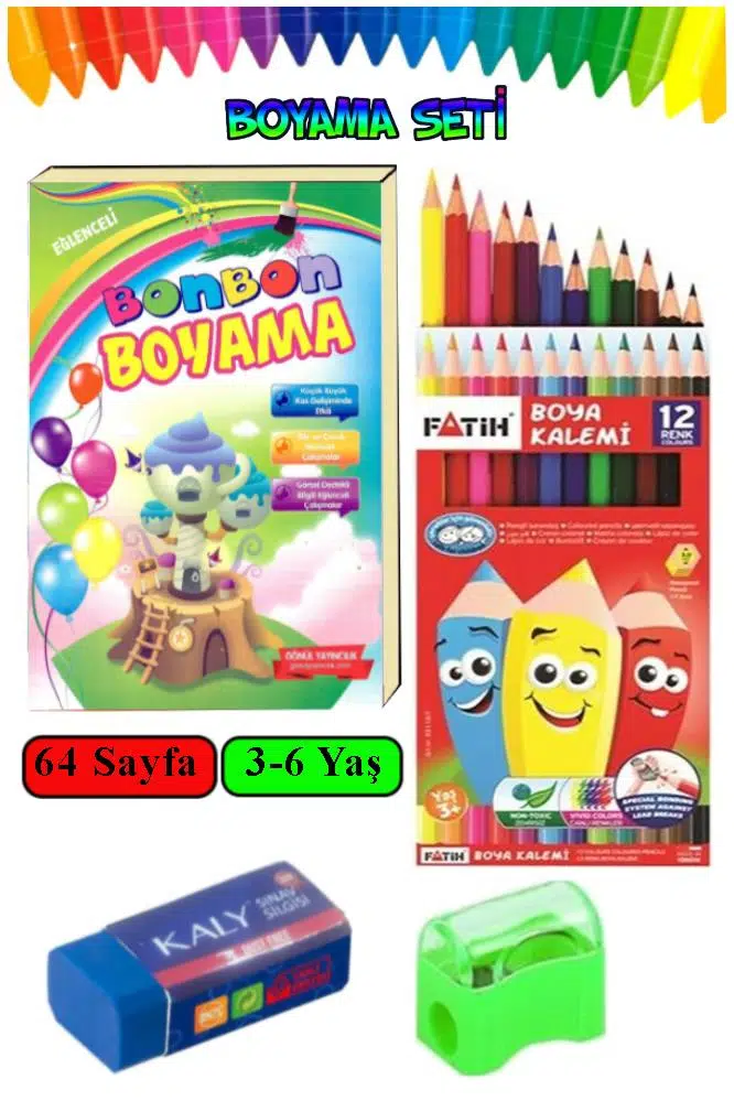 - Kalın boyama 64 sayfa 1 adet fatih 12 renk uzun kuruboya 1 adet silka sınav silgisi 1 adet kalemtıraş 1 adet olarak gönderim yapılmaktadır