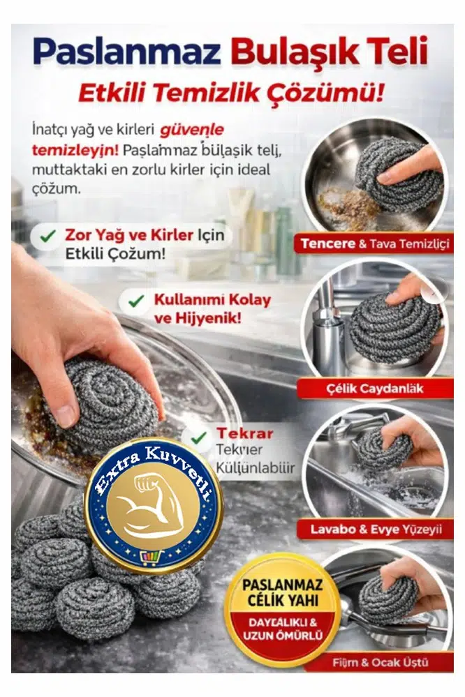 ·Yağ ve Kire Karşı Etkili: Temizlikte artık zorluk çekmeyeceksiniz; bu paslanmaz çelik ovma süngeri, tencere, fırın kapları, mutfak eşyaları, tezgahlar, ocaklar ve daha fazlasına yapışmış inatçı yağ ve zorlu parçacıkları sihirli bir şekilde temizler.