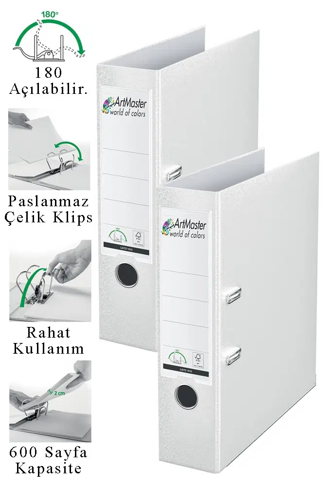 Ürün Adı: Artmaster Büro Klasörü Beyaz Geniş 2 Adet Plastik Geniş Beyaz Klasör Halkalı Paslanmaz Çelik Klipsli Ofis Büro