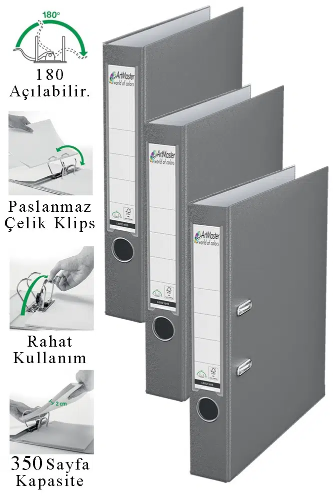 Ürün Adı: Artmaster Büro Klasörü Gri Dar 3 Adet Plastik Dar Gri Klasör Halkalı Paslanmaz Çelik Klipsli Ofis Büro