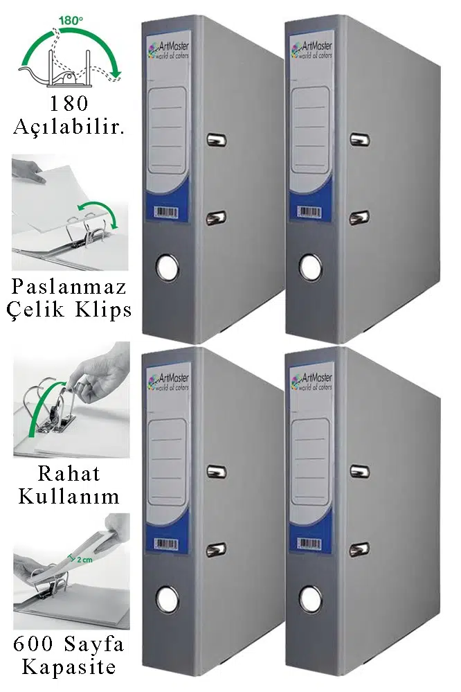 Ürün Adı: Artmaster Büro Klasörü Gri Geniş 4 Adet Plastik Geniş Gri Klasör Halkalı Paslanmaz Çelik Klipsli Ofis Büro