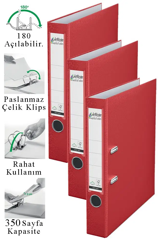 Ürün Adı: Artmaster Büro Klasörü Kırmızı Dar 3 Adet Plastik Dar Kırmızı Klasör Halkalı Paslanmaz Çelik Klipsli Ofis Büro