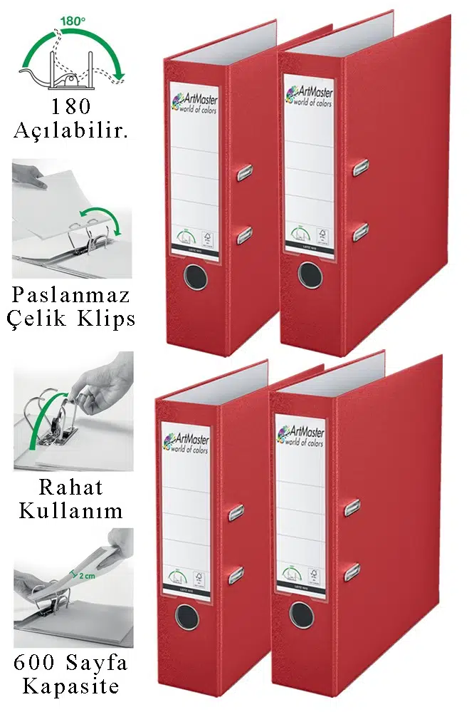 Ürün Adı: Artmaster Büro Klasörü Kırmızı Geniş 4 Adet Plastik Geniş Kırmızı Klasör Halkalı Paslanmaz Çelik Klipsli Ofis Büro