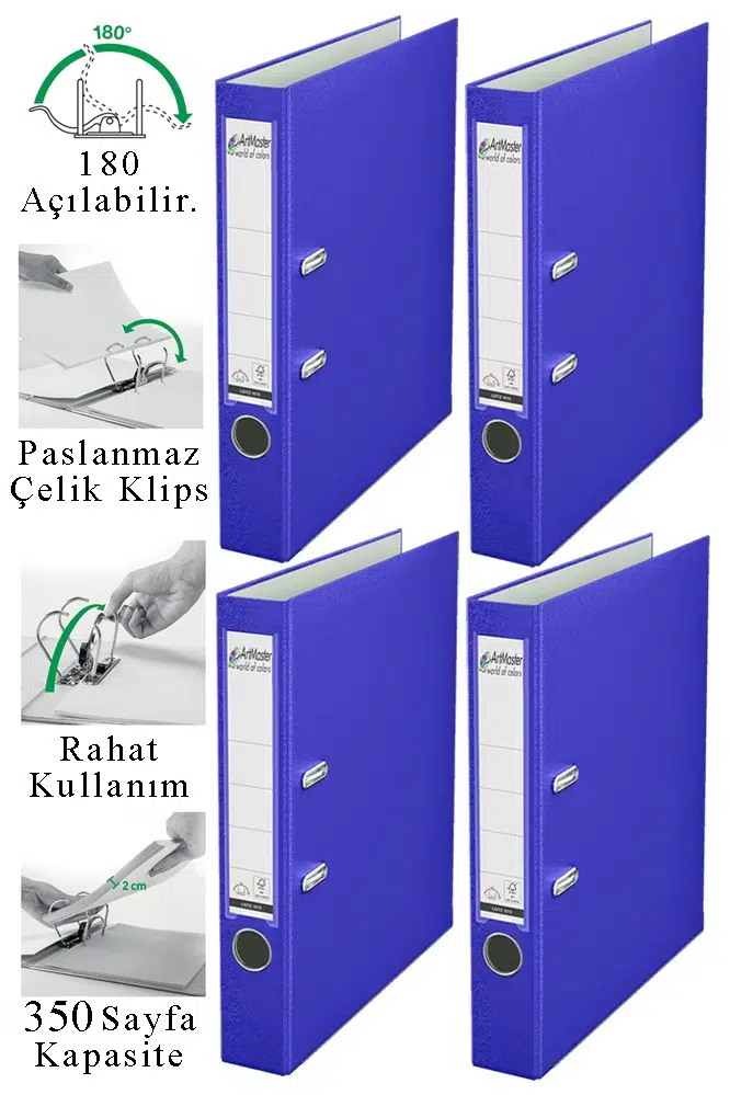 Ürün Adı: Artmaster Büro Klasörü Mavi Dar 4 Adet Plastik Dar Mavi Klasör Halkalı Paslanmaz Çelik Klipsli Ofis Büro