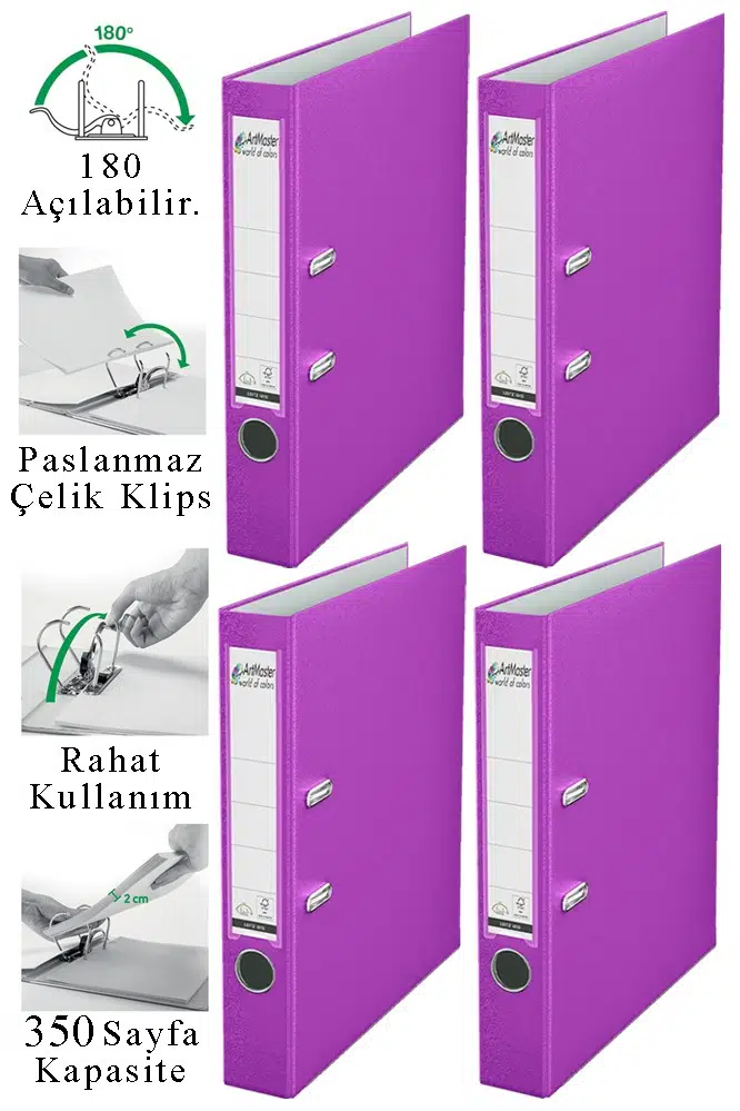 Ürün Adı: Büro Klasörü Mor Dar 4 Adet Plastik Dar Mor Klasör Halkalı Paslanmaz Çelik Klipsli Ofis Büro